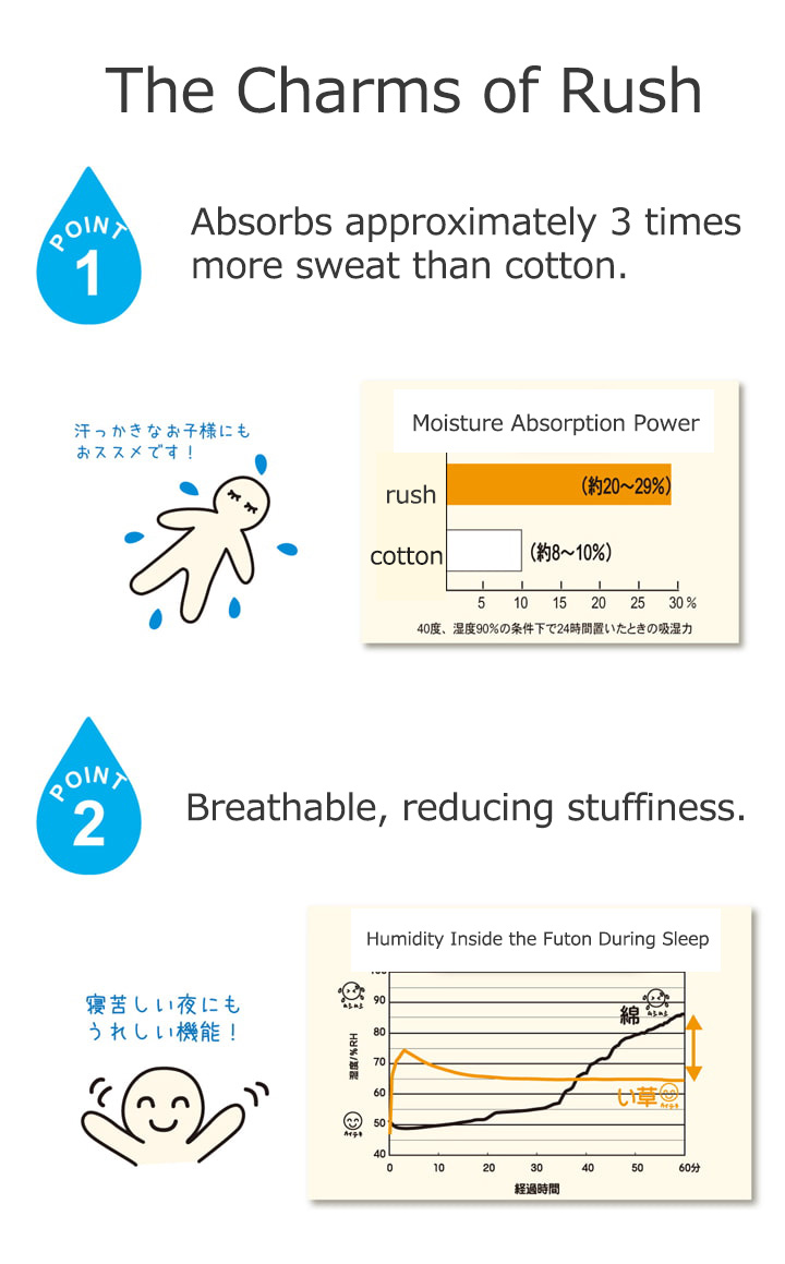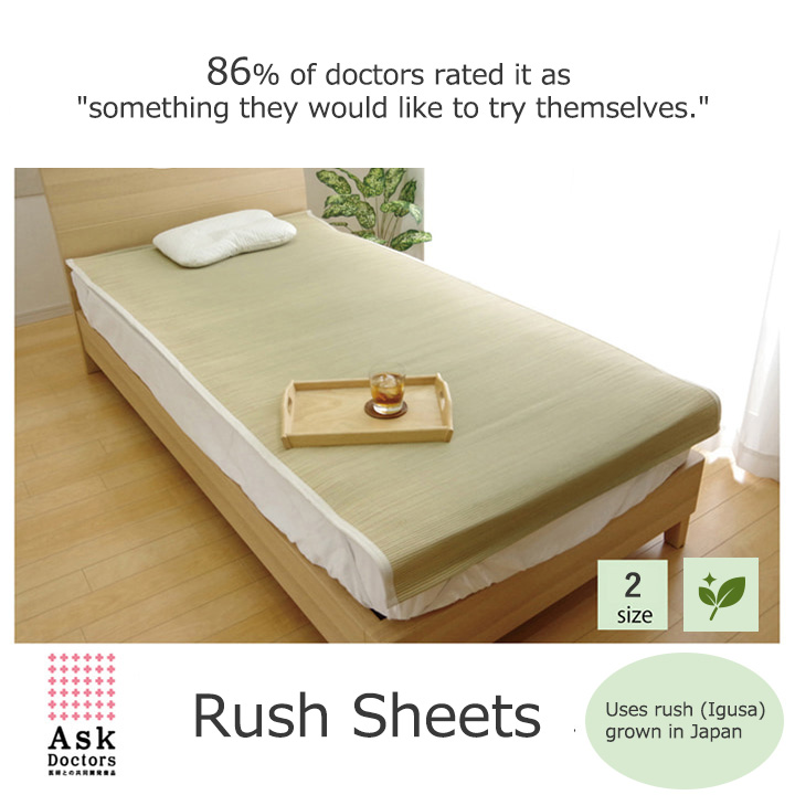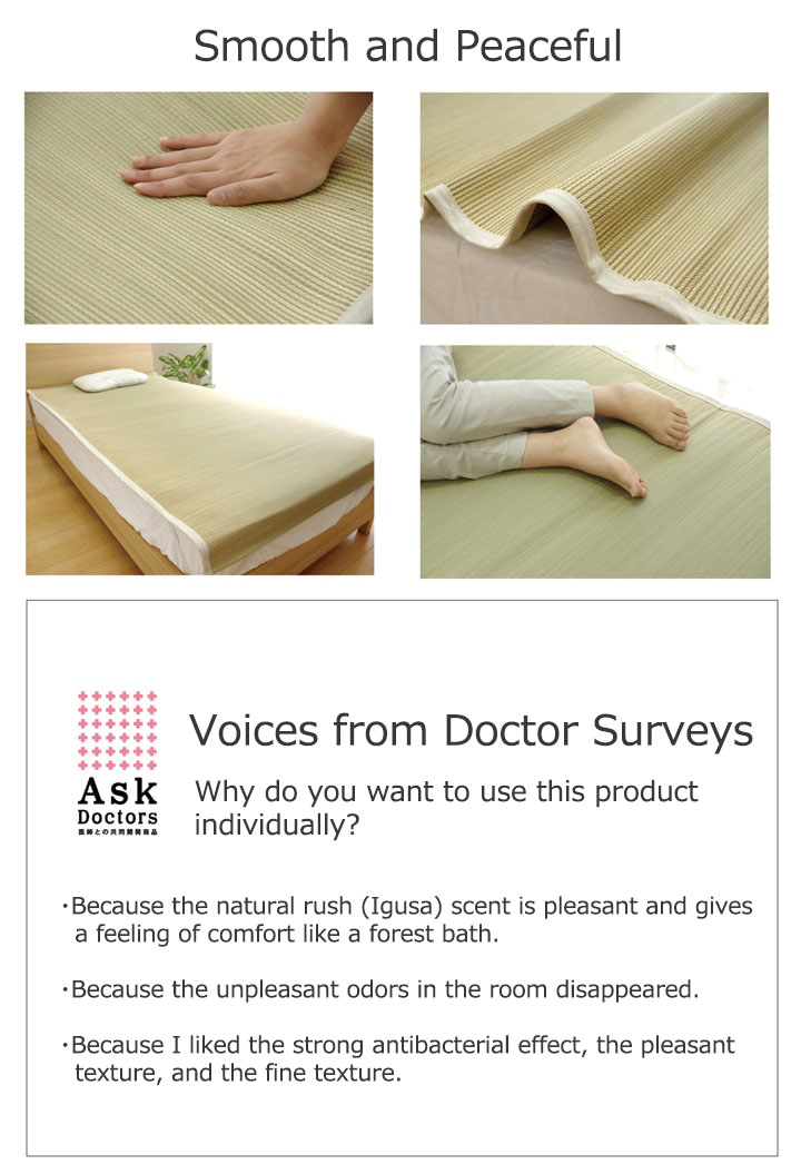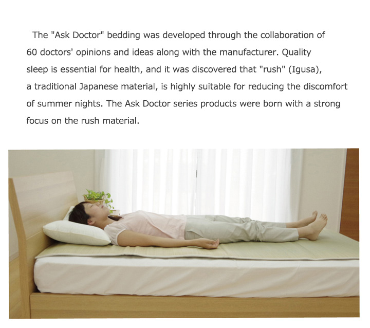 医師60名の意見・アイデアから快適な睡眠をサポートする「い草寝具シリーズ」を共同開発しました。長時間、肌に接する寝具だからこそ、自然素材を使い、やわらかな質感にこだわりました。快眠い草の効能として1.綿の約3倍の吸湿力 2.蒸れにくい。汗による湿気を吸うことにより温度を下げ快適な就寝を促します。 3.汗のにおいを軽減。汗のにおいの元となる化学物質を90%以上抑えます。などがあります。染料、染土を使わない国産(九州産)のしなやかなイ草を使用していますので、柔らかく、すべすべとしており身体にフィットします。い草に青森ヒバ加工を施しています。(抗菌、防臭効果)