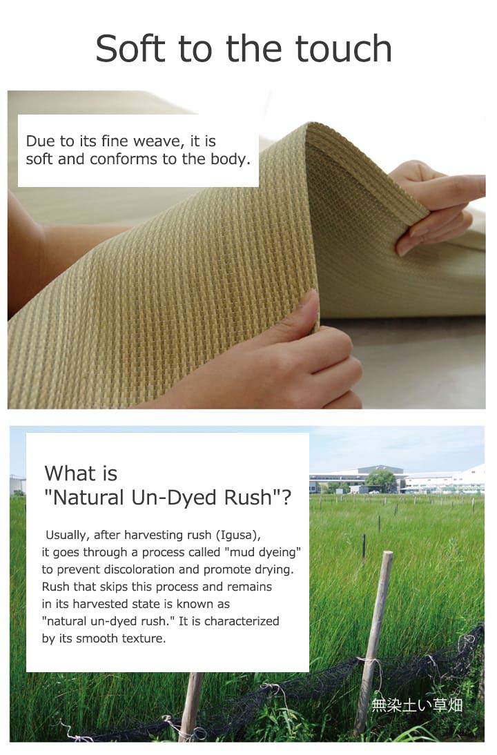 ■We use supple, domestically produced (from Kyushu) Igusa, which is soft and smooth to the touch, fitting comfortably to the body. No dyes or colored soil are used.